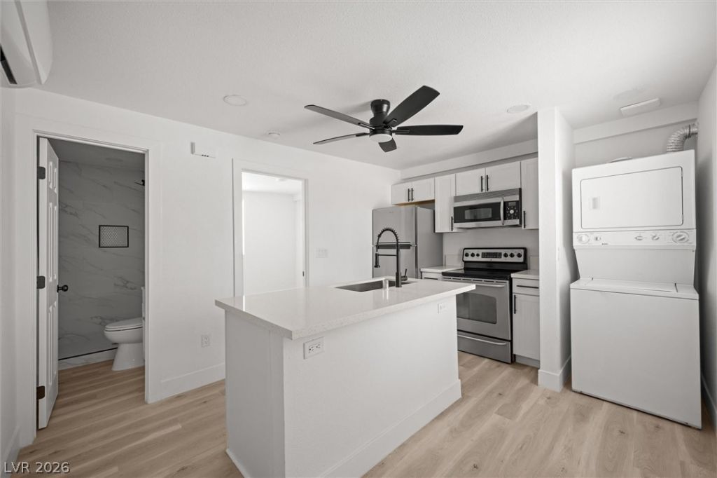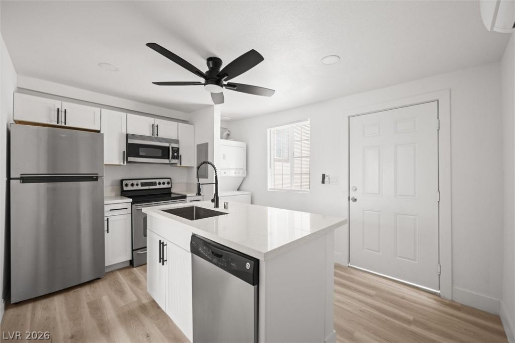Welcome home to this beautifully remodeled 1-bedroom unit in a turnkey fourplex, where modern design meets everyday convenience. Step inside to an open-concept layout featuring stylish laminate flooring, recessed lighting, and a bright, contemporary feel throughout. The upgraded kitchen is designed to impress with white shaker cabinets, quartz countertops, and stainless steel appliances?including a refrigerator, range, microwave, and in-unit stacked washer & dryer for added convenience.. The bathrooms have been thoughtfully updated with a sleek vanity and tiled shower, giving it a clean, modern finish. Enjoy peace of mind knowing the entire property has been upgraded with a new roof, windows, doors, and driveway, and a freshly painted exterior with crisp white walls and bold black trim for a sharp, modern look. This unit is Appx 400 Sq ft.