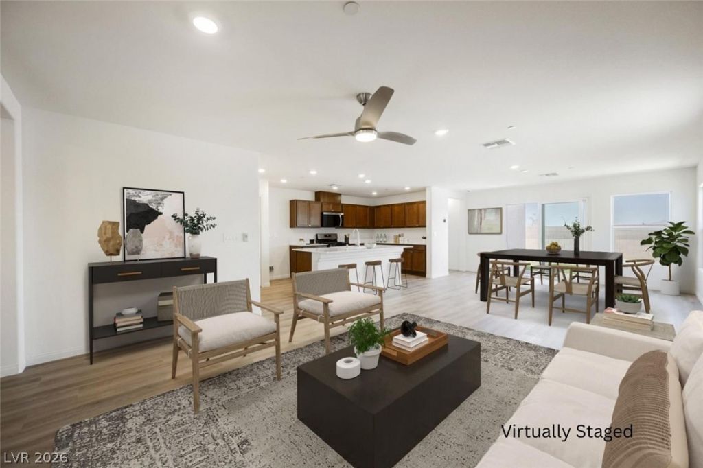 Welcome to your dream home in the gated community of River Mountain Trails, Henderson, NV 89015. This immaculate single-story residence boasts modern elegance with an open-concept layout, perfect for both relaxation and entertaining. The spacious kitchen features stylish cabinetry, a large island, and sleek appliances. Enjoy abundant natural light and seamless indoor-outdoor living with sliding doors leading to a beautifully landscaped, low-maintenance backyard. The master suite offers a serene retreat with an ensuite bathroom and a generous walk-in closet. Additional bedrooms provide comfort and versatility. Nestled near scenic trails and convenient amenities, this home offers the perfect blend of tranquility and convenience. Don't miss your opportunity to own this stunning property!